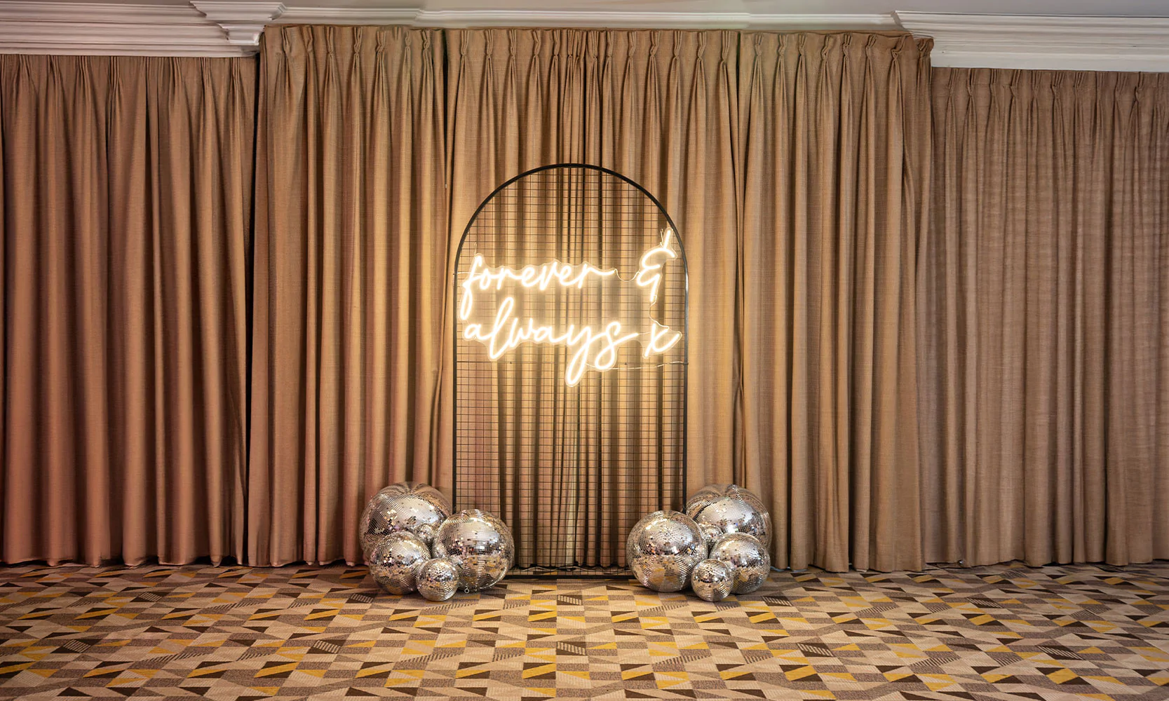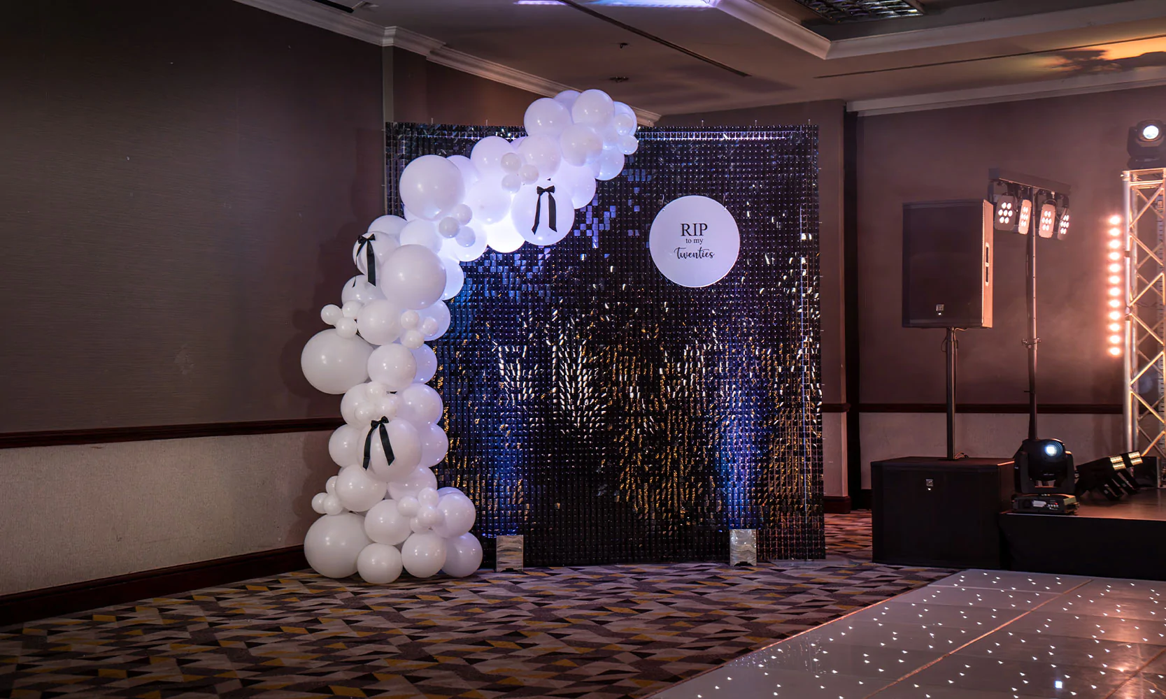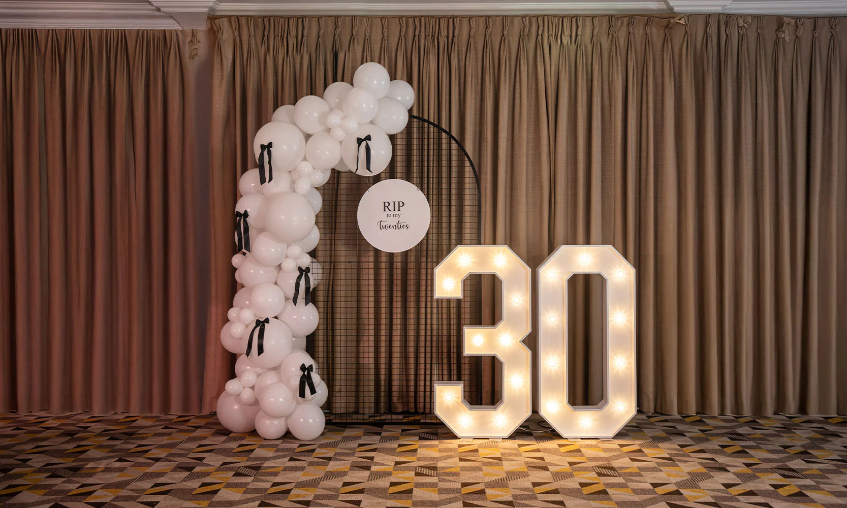 We’ve styled monochrome weddings with dramatic black arches adorned in white florals, Gatsby-inspired birthday parties with mirrored bar fronts and checkerboard dance floors, and corporate soirées where minimalism meets luxe.
