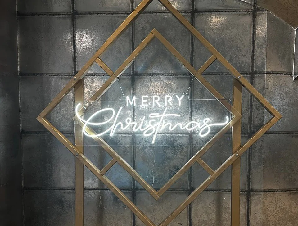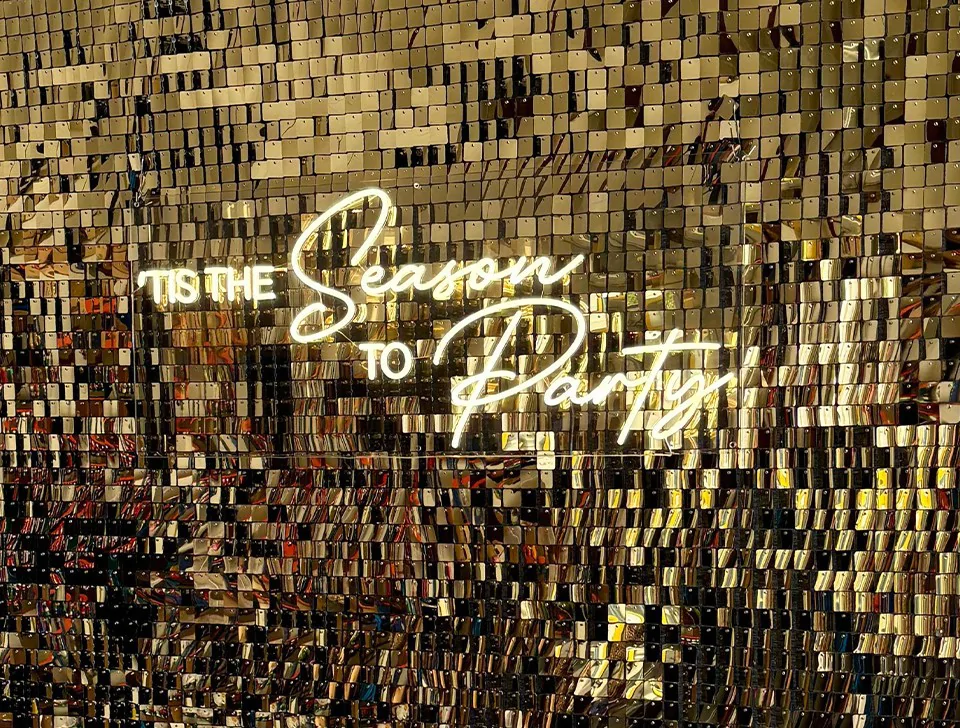 The most popular festive party decor items this year include bespoke neon signs, sequin wall photo backdrops, white LED dance floors and large light-up letters with bright balloon garlands. We can also light your party room with coloured uplighting to match your theme.