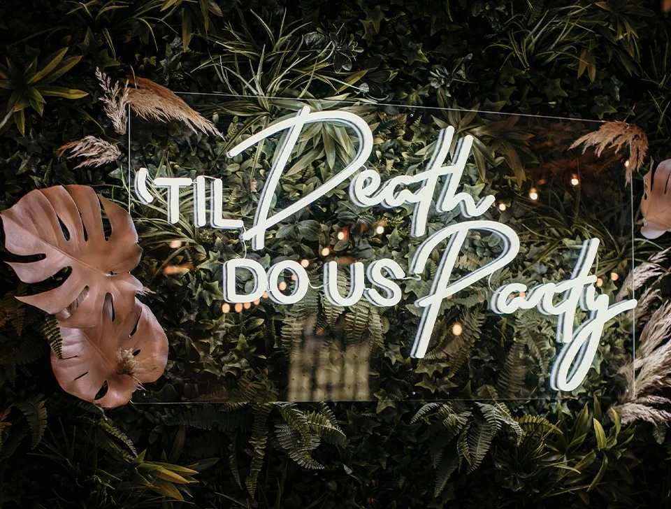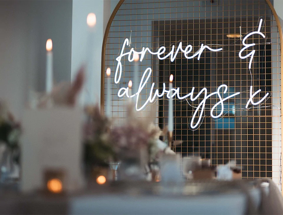 Elizabeth James Events offer a bespoke neon sign service, please get in touch with our expert team and they'll be able to assist with the design and provide costs for you to purchase your very own neon, which you can keep to use at future events.
