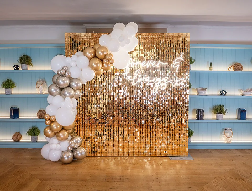 The most popular festive party decor items this year include bespoke neon signs, sequin wall photo backdrops, white LED dance floors and large light-up letters with bright balloon garlands. We can also light your party room with coloured uplighting to match your theme.