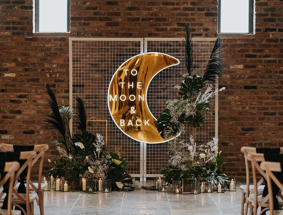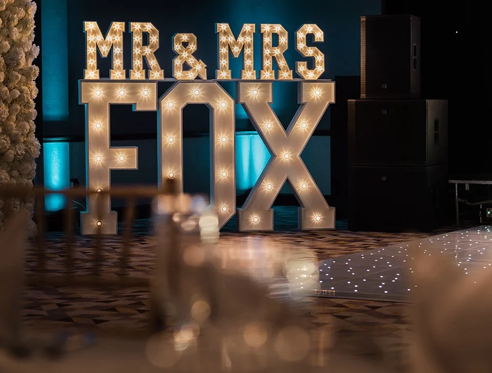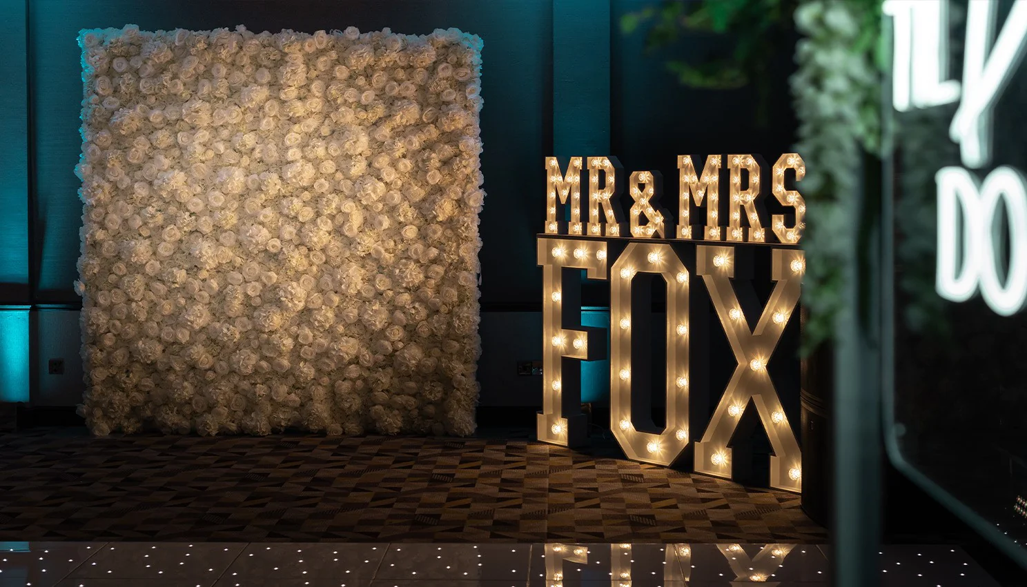 You've chosen the perfect Midlands venue for your big day, but now it's time to personalise that space with a luxury wedding decor package. Our range features decor pieces for throughout your day - light-up initials can add some subtle sparkle to your ceremony, a flower wall can be the perfect backdrop for your drinks receptions photos and your party will go to another level with a white LED dance floor, personalised neon and Mr & Mrs 'Surname' 4ft light-up letters.