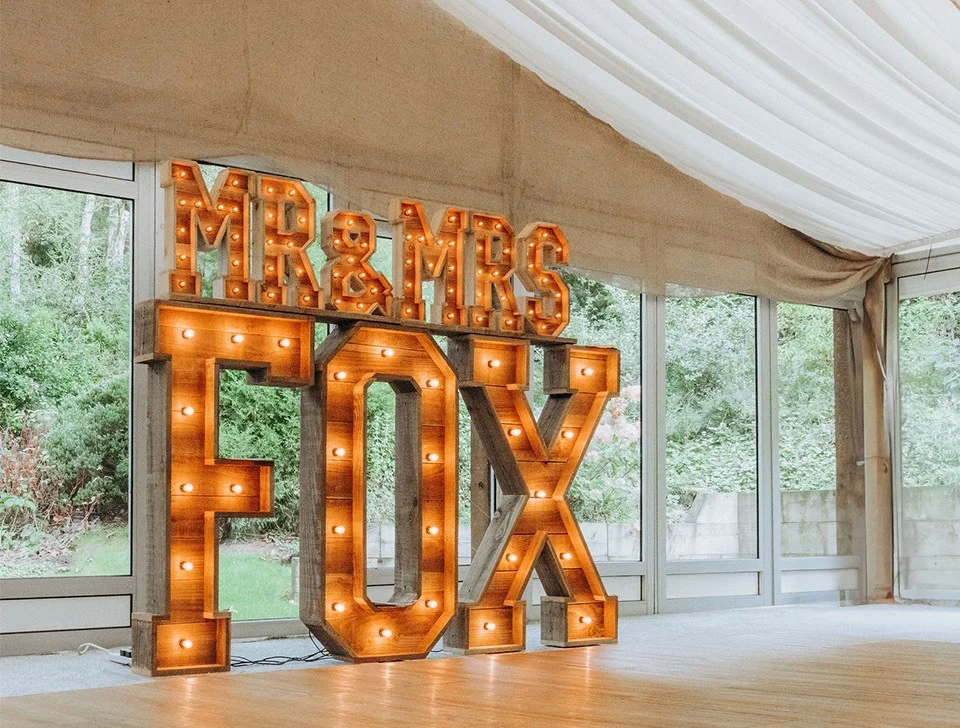 The most popular wedding decor items this year include neon signs, white LED dance floors, rustic frames with festoon lighting, flower walls and large light-up letters (rustic and white) that can be used to spell a name or word of your choice. We're also seeing a trend for outdoor games and activities, including bouncy castles, which can be made to look extra special with bespoke balloon garlands.