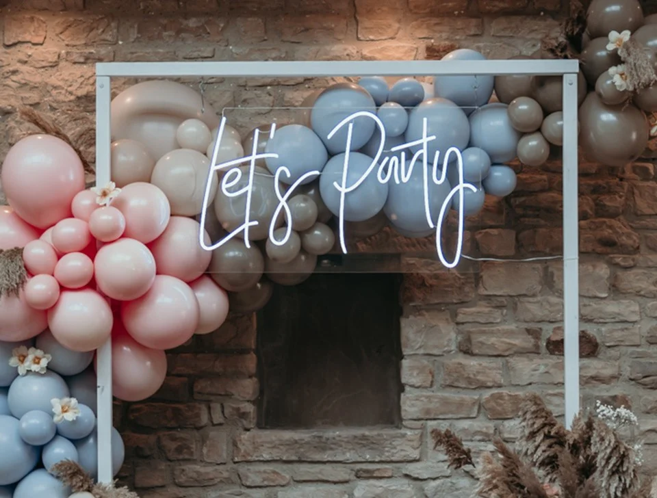 The most popular school and college prom decor items this year include bespoke neon signs, sequin wall photo backdrops with branded acrylic disc and themed balloon garlands, white LED dance floors and large light-up letters spelling your school or college name. We're also seeing a trend for outdoor games and activities, including bouncy castles, which can be made to look that bit more special with bespoke balloon garlands.