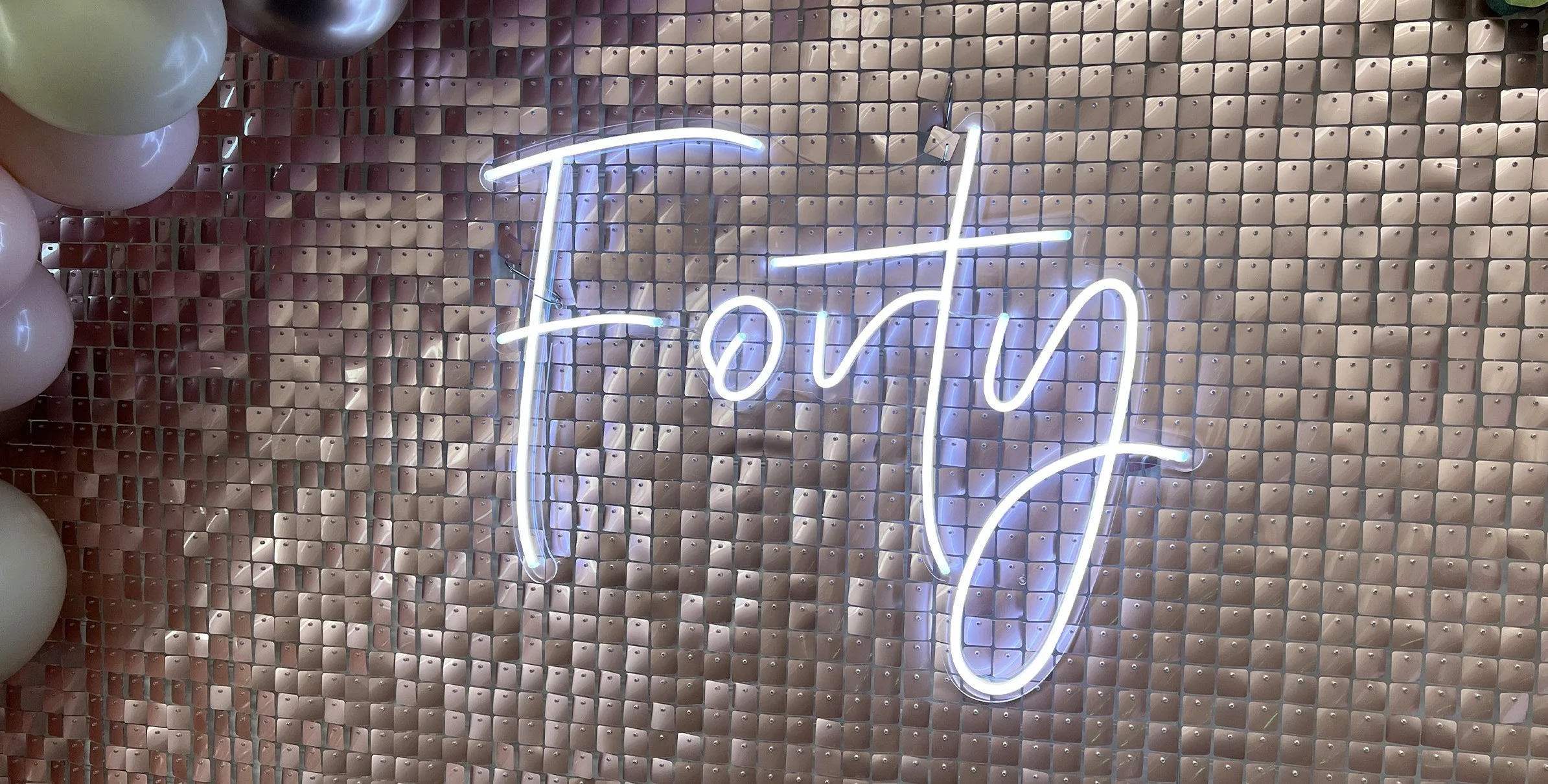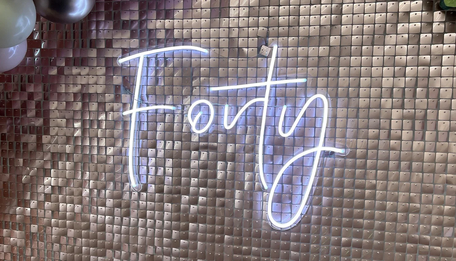 Hire our Neon 'Forty' Sign alone and you can hang or prop it somewhere suitable at your home or venue, or hire along with any of our frames or backdrops, such as our Silver Sequin Wall or Blush Flower Wall, with or without a co-ordinating balloon garland, depending on the vibe you're going for!
