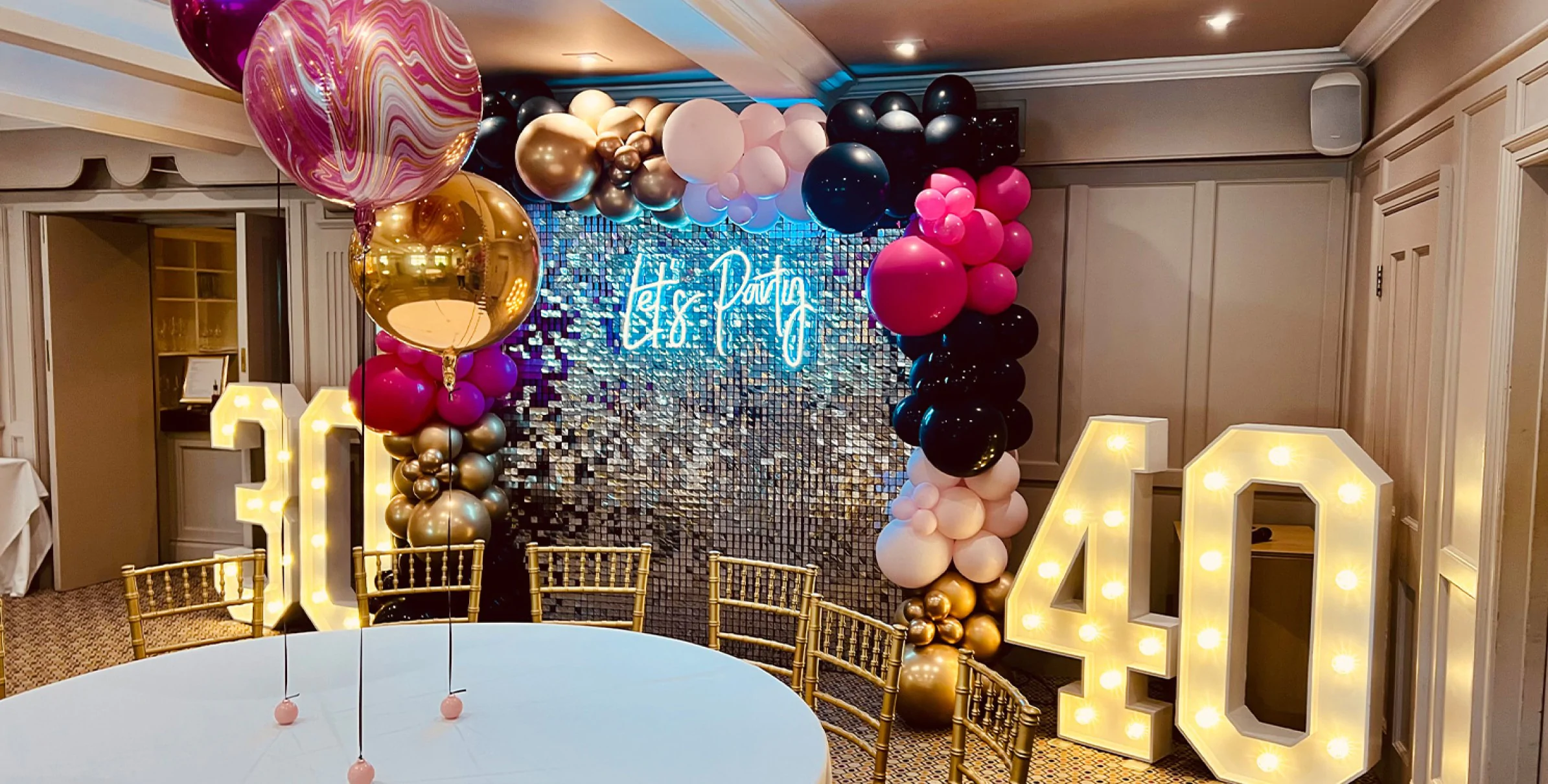 I wanted to say a HUGE thank you to you both and Elizabeth James Events. I was absolutely delighted with all of the decorations that you supplied and set up, it was a complete surprise for my husband and it certainly made for a fantastic surprise.. he loved it! It made for a very special entrance for all of our guests and everyone commented how amazing it all looked. You made everything so straight forward for me which was most appreciated in the middle of planning a big party. Hannah, I really appreciate you working so well with the manager at the Golf Club and creating such a fantastic set up. Equally I know that the Golf Club appreciated everything being taken down in such a timely manner on the Sunday before their busy Sunday lunch time. The decorations played a big part of our special occasion and I will not hesitate to recommend you to my family and friends. Thank you once again and I will certainly be in touch the next time I’m planning a party or event!