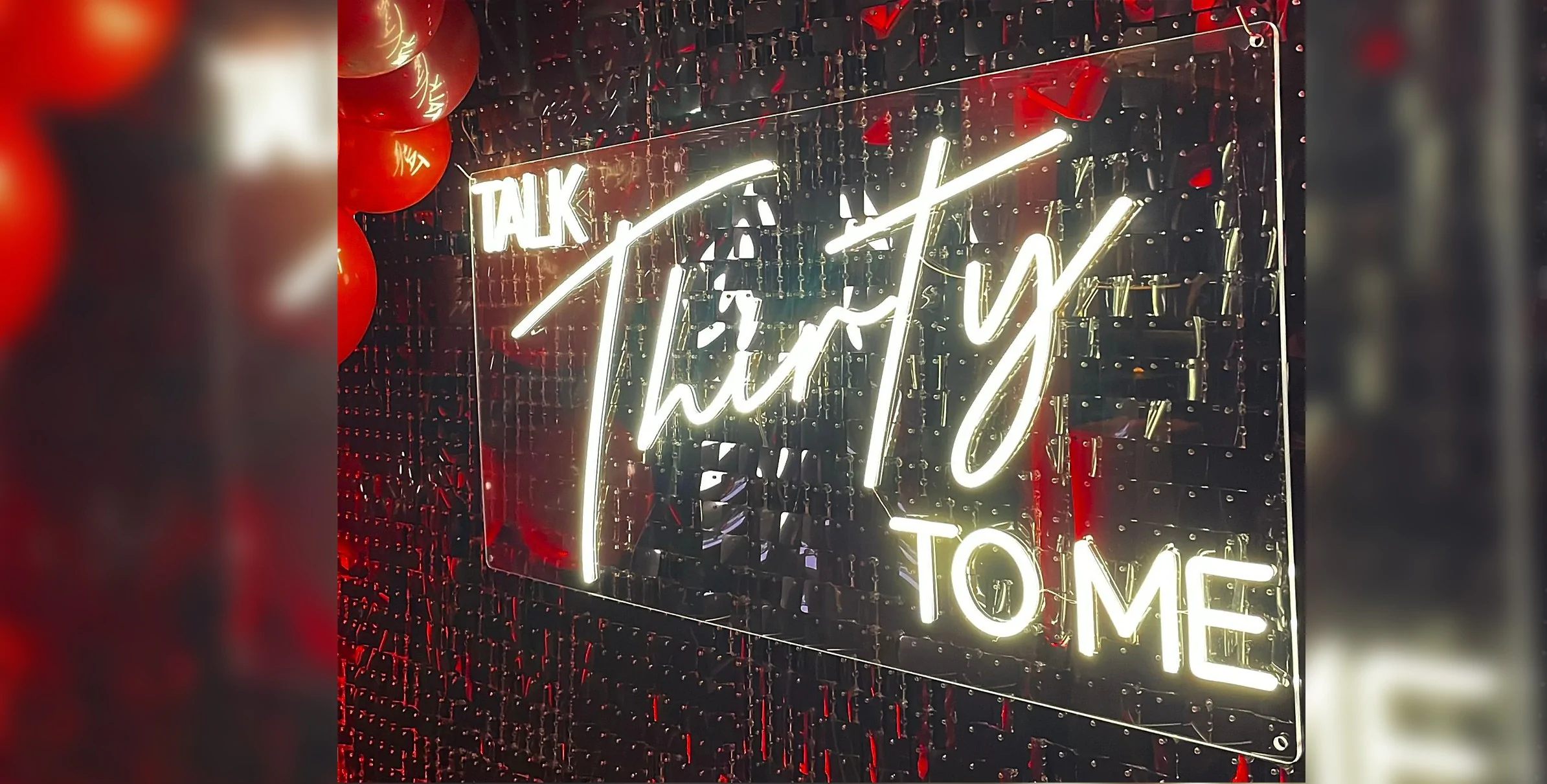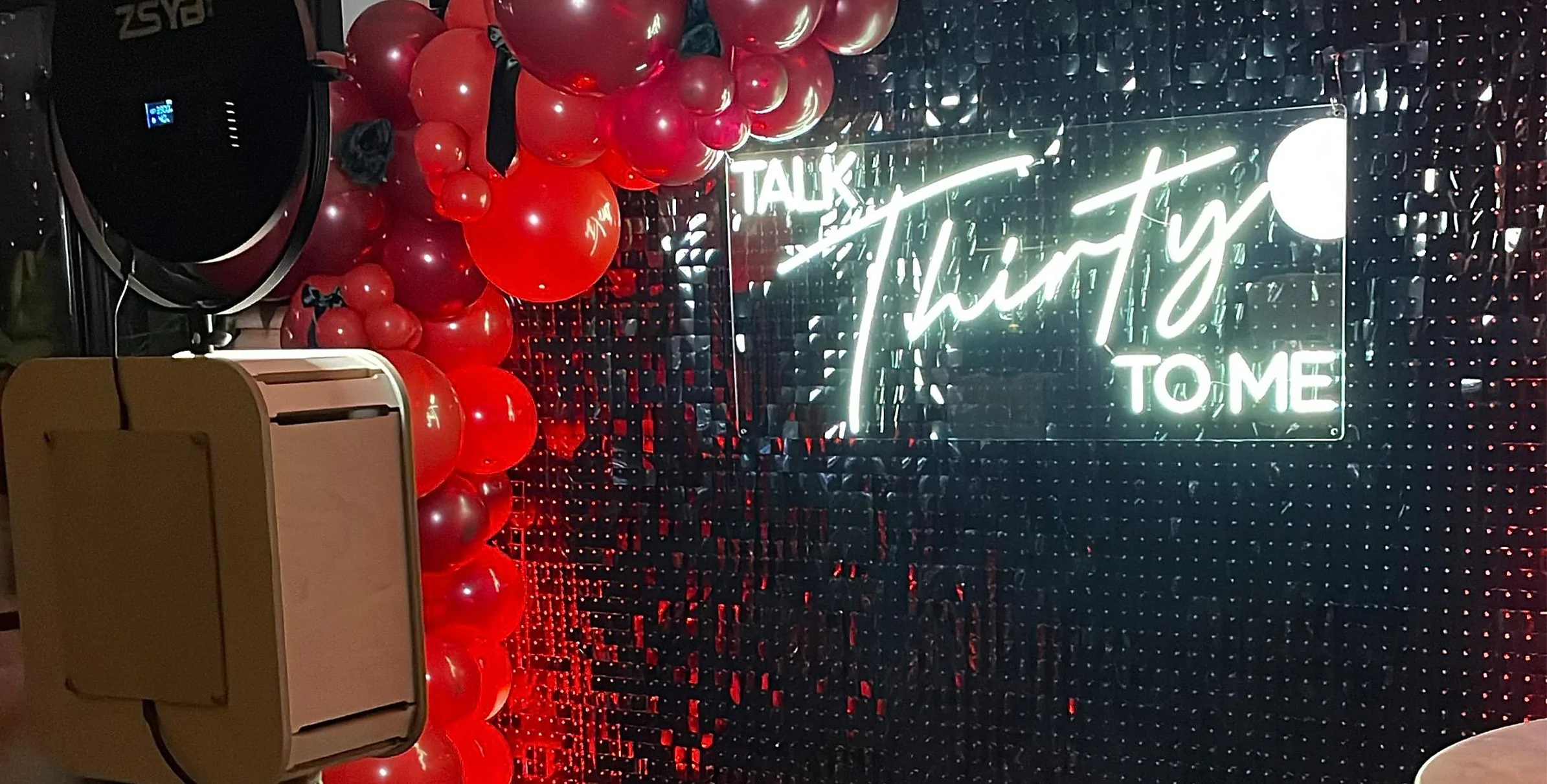 Perfect for 30th birthday parties, private dinners, or stylish event spaces, this neon sign can be hired on its own or as part of a coordinated decor package with balloons, backdrops, and lighting to match your theme.