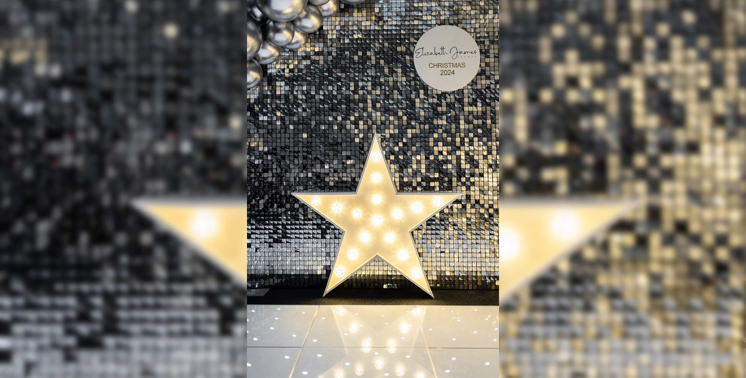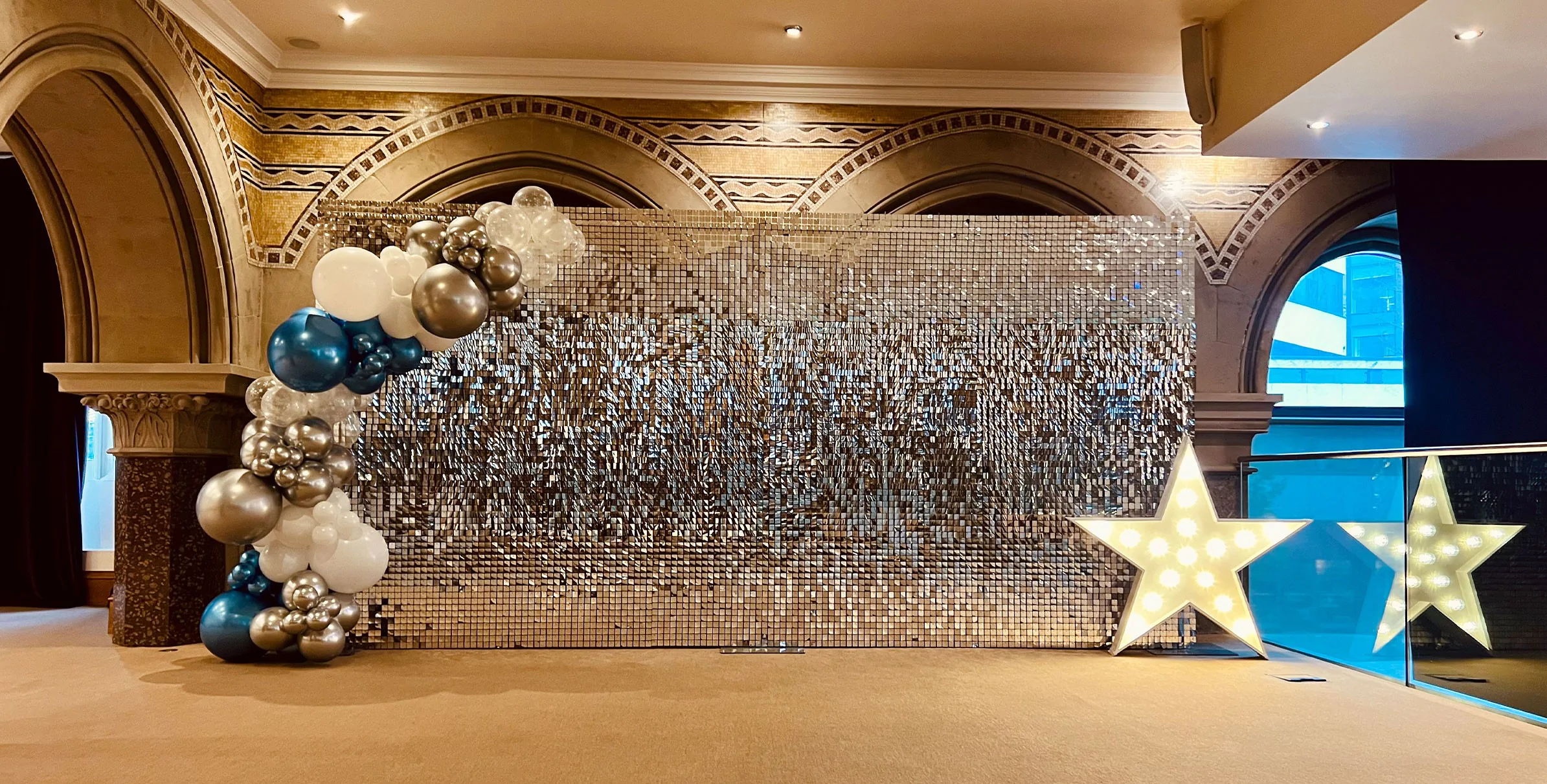The silver sequin wall and balloon garland backdrop will give you and your guests the most incredible photo opportunity, and with a custom branded acrylic disc you can ensure your company logo and/or event name accompanies every photo.