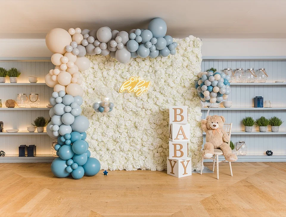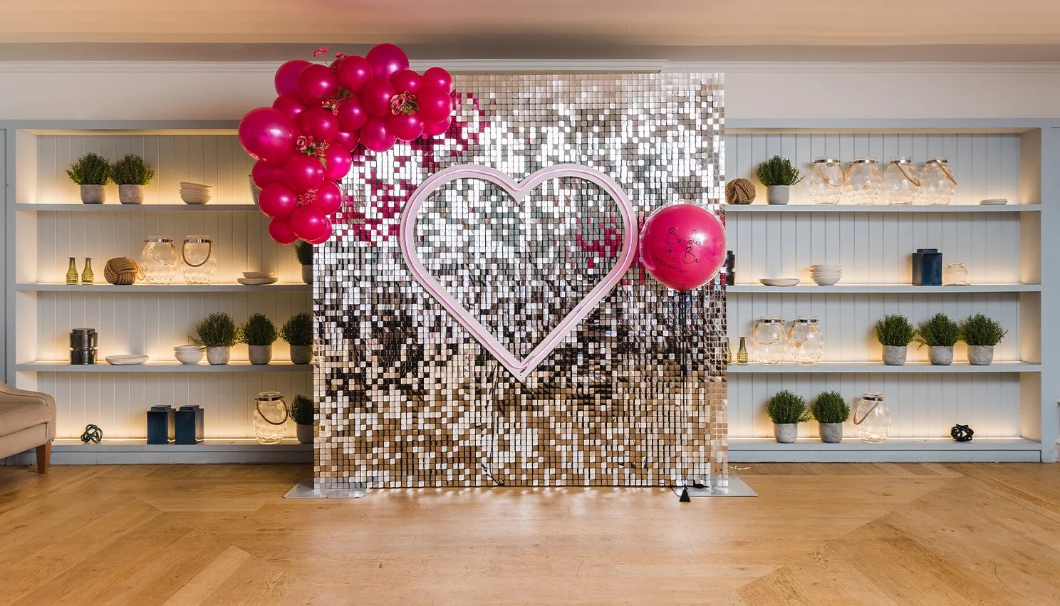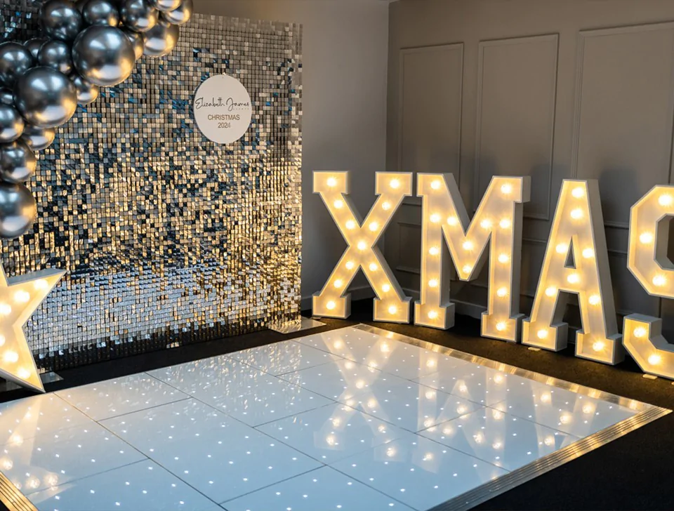 The most popular event decor items this year include bespoke neon signs, sequin wall photo backdrops with branded acrylic disc and themed balloon garlands, white LED dance floors and large light-up letters spelling your word of choice. We're also seeing a trend for outdoor games and activities, including bouncy castles, which can be made to look that bit more special with bespoke balloon garlands.